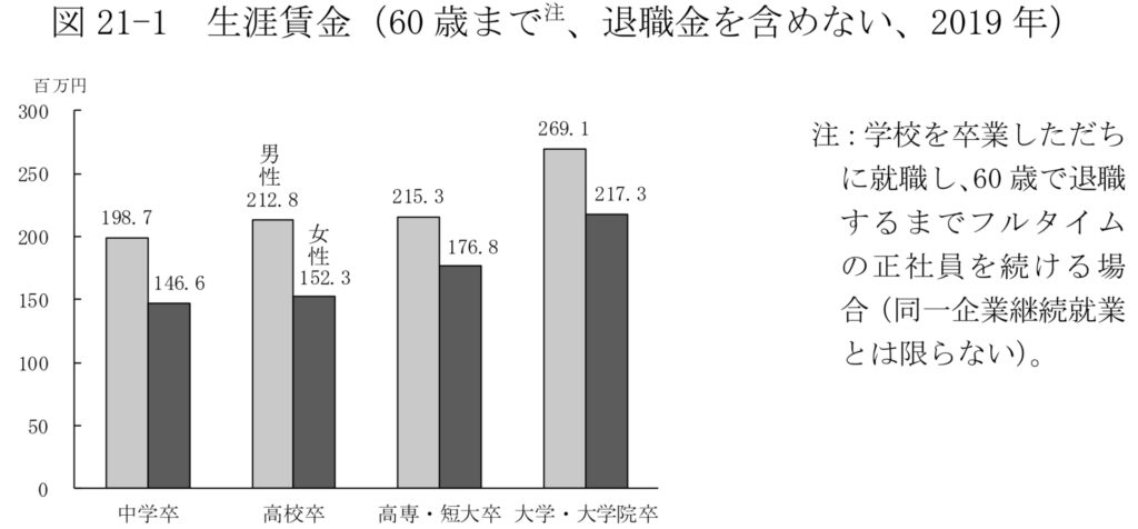 平均年収がこれだけ違うと、生涯収入ももちろん大きく差が開きます。