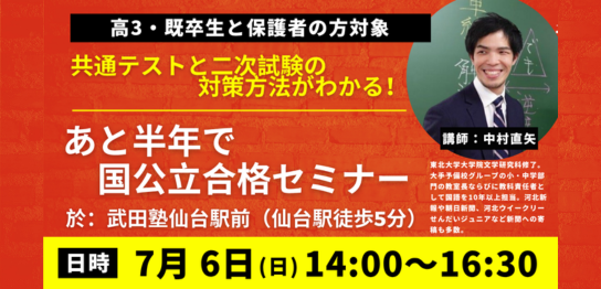 2025年7月6日(日)、武田塾仙台駅前校にて「あと半年で国公立大学合格セミナー
