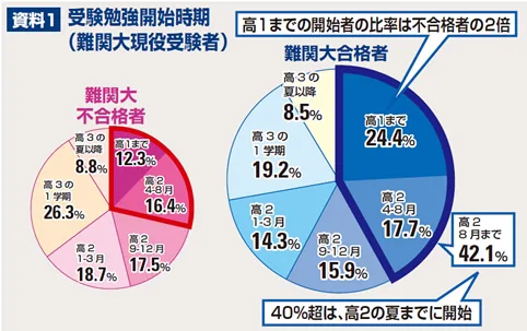 難関大学の合格者と勉強の開始時期をまとめたグラフです。