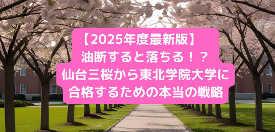 ブログ2025年5月15日AO入試, 一般入試対策, 三桜高校, 世界史対策, 仙台の塾, 仙台三桜高校, 共通テスト対策, 参考書紹介, 受験勉強, 受験情報ブログ, 国語対策, 地理対策, 大学受験, 学院大, 宮城の高校生, 指定校推薦対策, 政治経済, 数学参考書, 日本史勉強法, 東北学院大学, 武田塾, 総合型選抜対策, 英語勉強法, 評定対策【2025年度最新版】 油断すると落ちる!?仙台三桜高校から東北学院大に合格するための本当の戦略はじめに 「東北学院大学は簡単に合格できる」――そんなふうに思っていませんか?確Read More